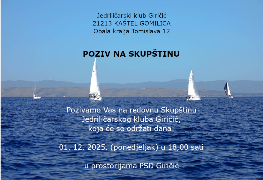 Pozivamo sve članove Jedriličarskog kluba Giričić na redovnu Skupštinu JK, koja će se održati 01. 12. 2025. godine (ponedjeljak) u 18:00 sati, prostorije PSD Giričić.