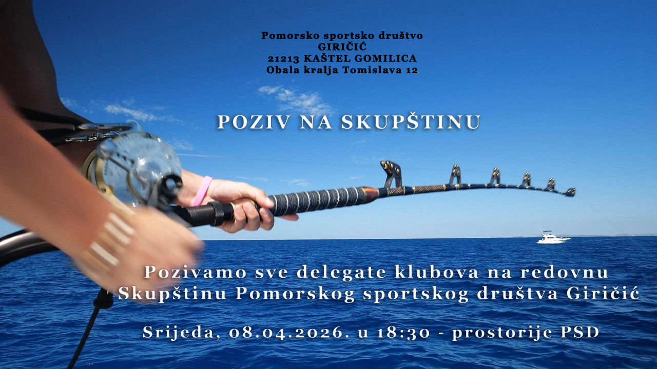 Pozivamo sve delegate klubova Pomorskog sportskog društva Giričić na redovnu Skupštinu PSD, koja će se održati 08. 04. 2026. (srijeda) u 18:30 sati, prostorije PSD Giričić.